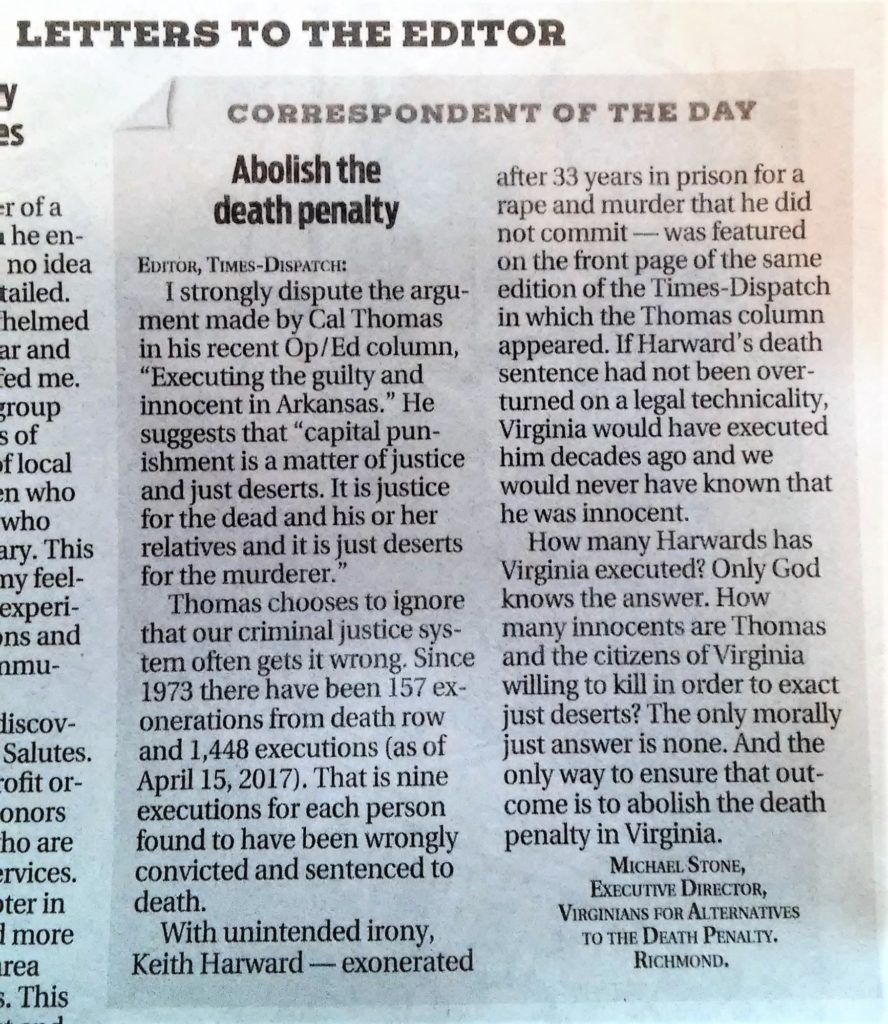 I strongly dispute the argument made by Cal Thomas in his recent Op/Ed column, “Executing the guilty and innocent in Arkansas.” He suggests that “capital punishment is a matter of justice and just deserts. It is justice for the dead and his or her relatives and it is just deserts for the murderer.”